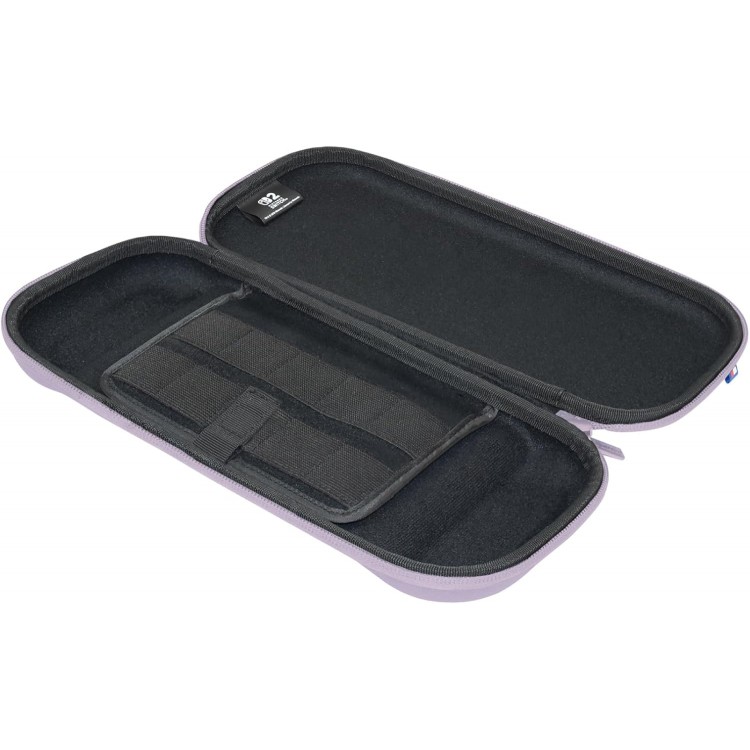 داخل کیف، محافظی نرم برای صفحه نمایش و پنلی فرورفته برای نگهداری ایمن کنسول قرار دارد که از آنالوگها و نمایشگر محافظت میکند. همچنین دو جعبه بازی اضافی در کیف گنجانده شده که هرکدام ظرفیت نگهداری ۴ کارتریج را دارند—به همراه جایگاه مخصوص کارتهای microSD. همه چیز مرتب و در دسترس.